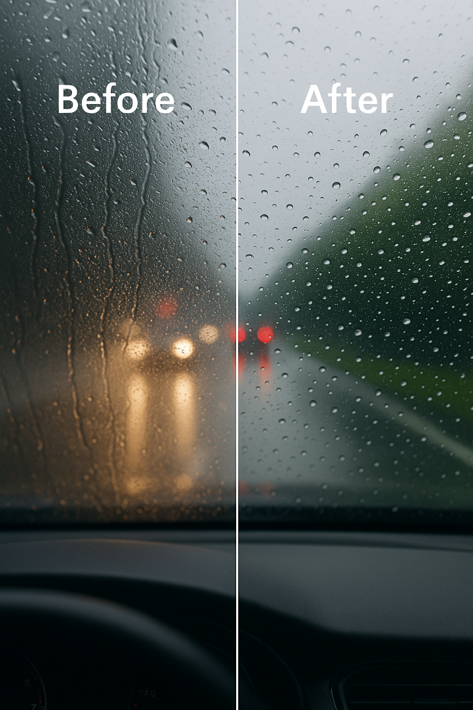 I’m usually the one driving our kids to school, sports, etc., and we get a lot of rainy mornings. I bought this mainly for extra safety and I can honestly see the difference. On wet days, the side windows and mirrors stay clearer, and I don’t get that heavy glare from headlights behind me. My husband even commented that the “after” view looks like someone cleaned the windshield from the inside. It took maybe 10 minutes to apply and has lasted through several car washes already.