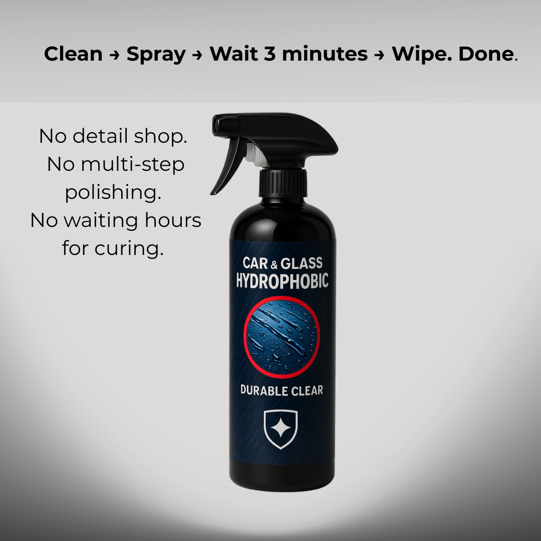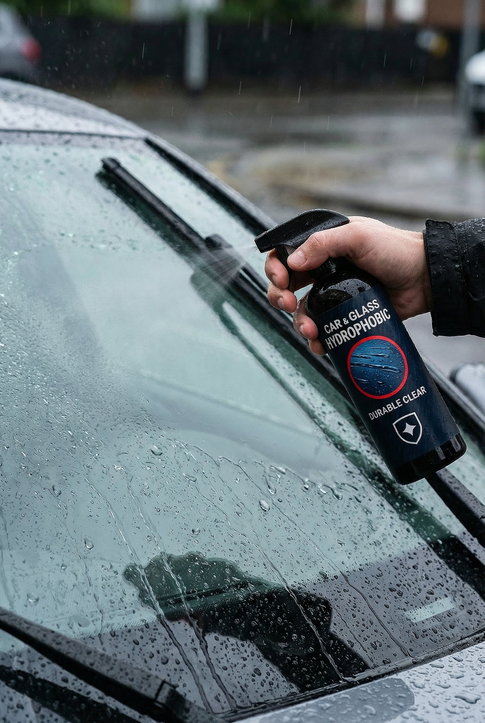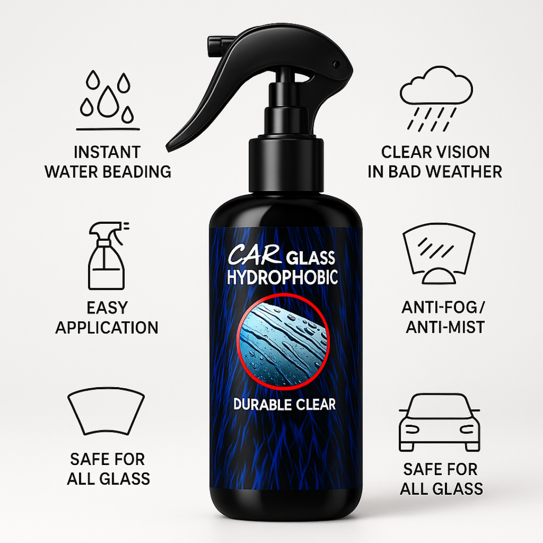 Our Car & Glass Hydrophobic Spray creates a transparent, long-lasting protective coating that repels water, reduces glare, and keeps your windshield crystal clear in seconds.